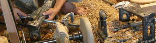 工程ページ仕上げ(動画)の最初に見られるように 左の「つめ」と称する回転軸に打ち付けます。 つめは楔形をしている為抜けにくい状態になり その工程を終了後はたたいてはずし次の工程へ進みます。 |